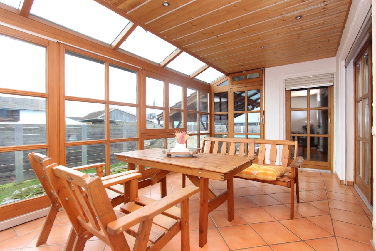 Vom Wohnzimmer wie auch vom Esszimmer aus kann der beheizbare Wintergarten betreten werden. Über den Wintergarten kann die komplett überdachte Terrasse im eignen Garten erreicht werden. An sonnigen Tagen sorgt der große aufgestellte Pool für Abkühlung.