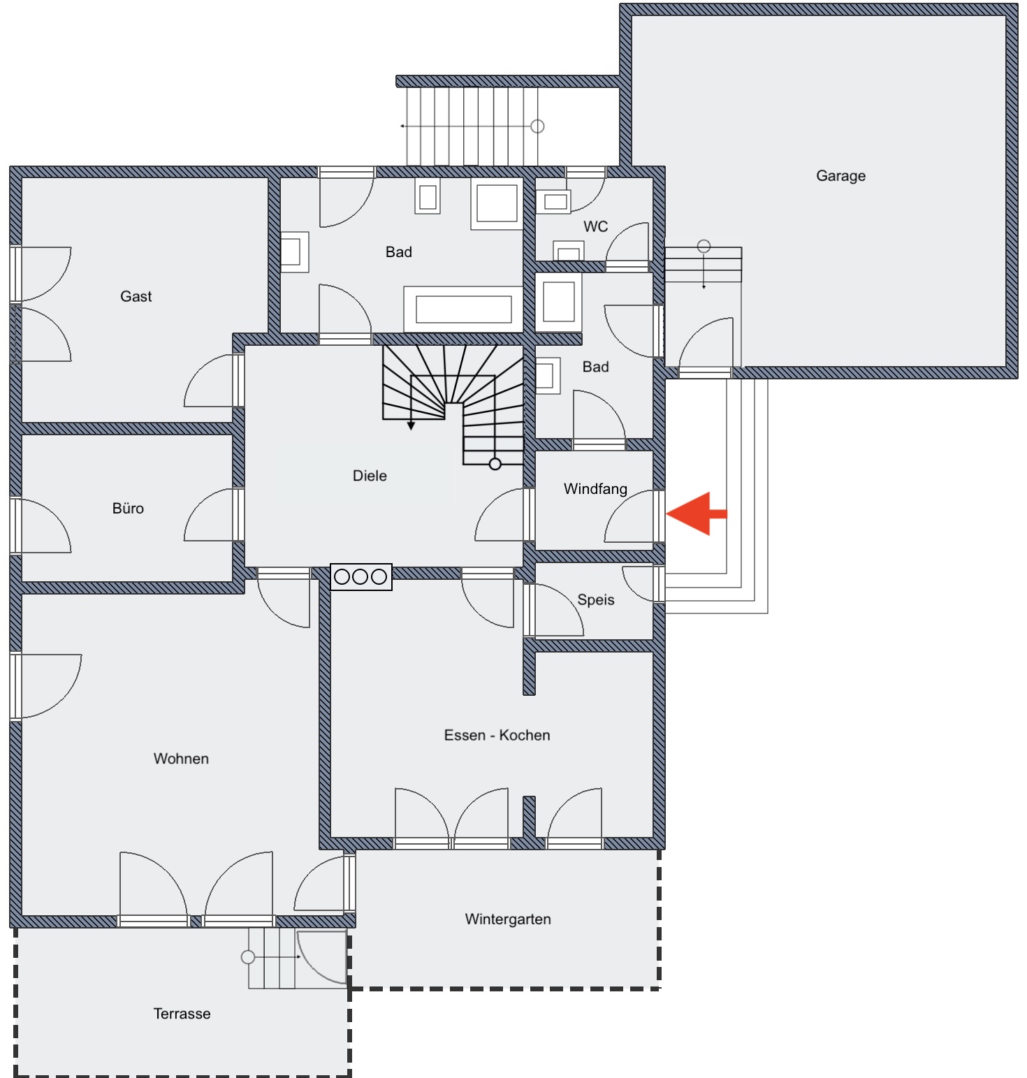 EG: Windfang, Diele, Gästebad, Bad, Gästezimmer, Büro, Wohnzimmer, Esszimmer - Küche, Wintergarten