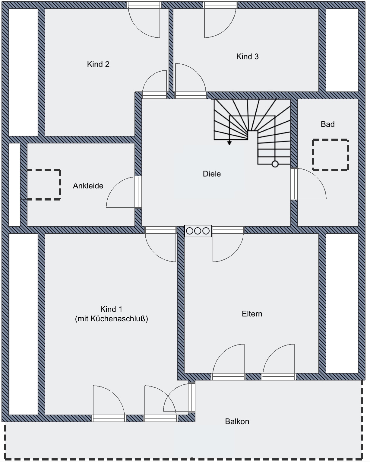 OG: Diele, 3 Kinderzimmer, Elternschlafzimmer, Ankleidezimmer, (Badmöglichkeit Raum nicht ausgebaut, Anschlüsse vorhanden)