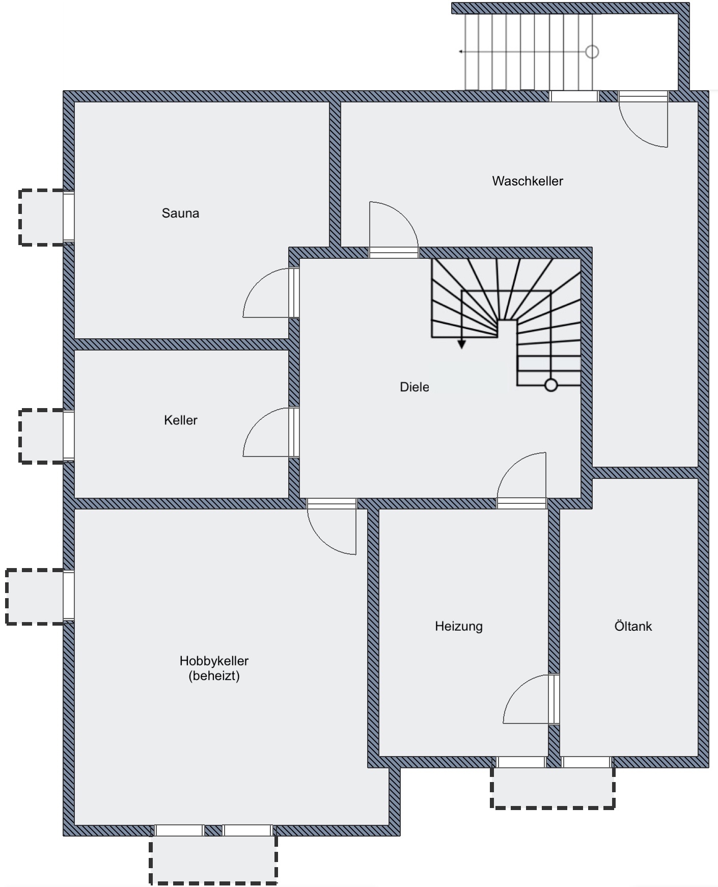 Keller: Hobbykeller (beheizt), Kellerraum, Sauna, Waschküche, Heizraum, Tankraum (zwei Öltanks mit insg. 8000 Liter Fassungsvermögen)