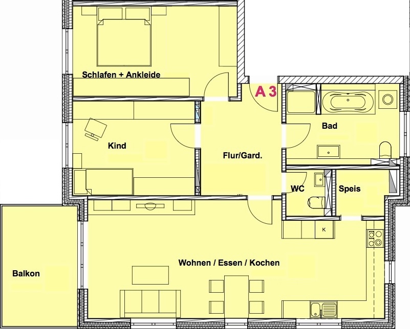 Die gut geschnittenen ca. 94 qm teilen sich wie folgt auf: Tageslichtbad mit bodengleicher Dusche und Badewanne, Schlafzimmer, Kinderzimmer, Gäste WC, Speis und einen sehr großen Wohn-Ess-Küchenbereich, von dem aus der komplett überdachte Südwest-Balkon betreten werden kann.