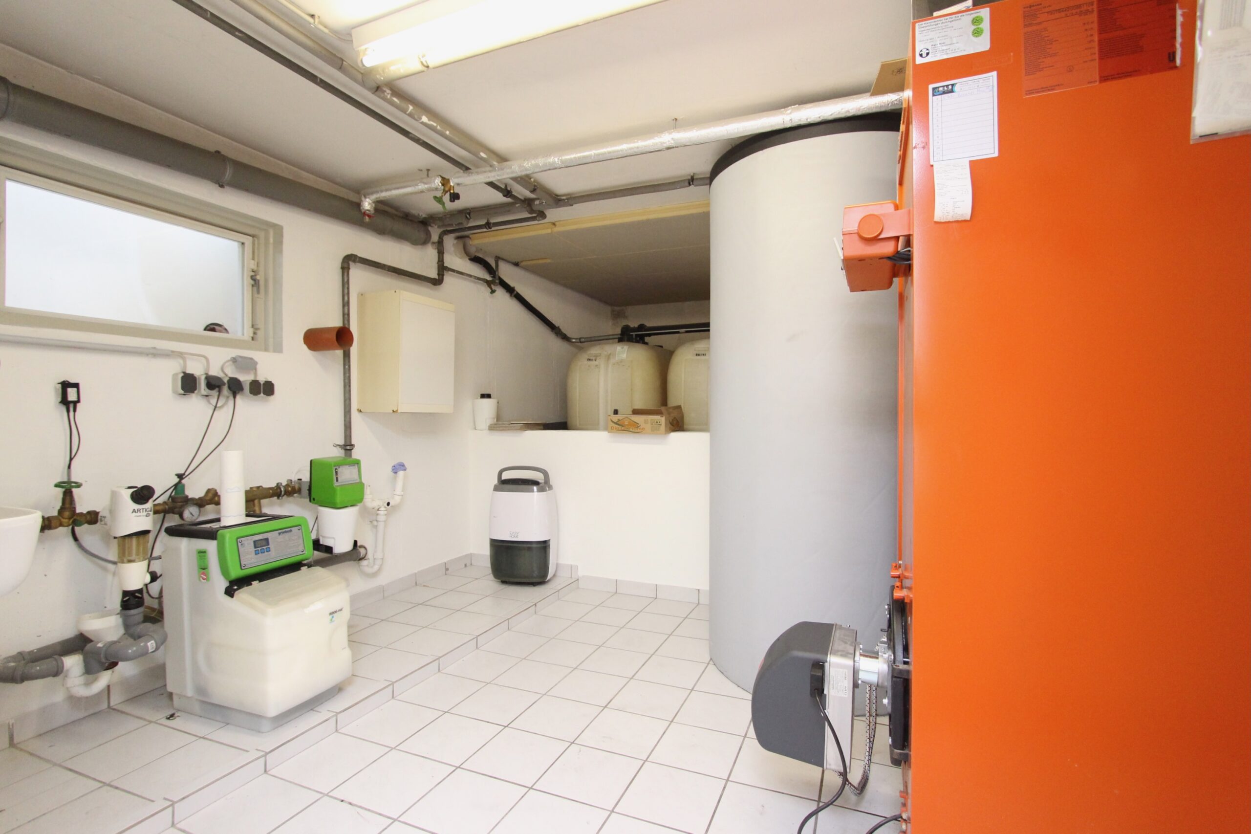 Für behagliche Wärme sorgen Heizkörper, die über eine Ölheizung (Brenner wurde dieses Jahr erneuert) versorgt werden. Um die Heizkosten zu sparen, wurde eine solarbetriebene Warmwasseraufbereitungsanlage installiert. Eine Wasserenthärtungsanlage befindet sich im Keller.
