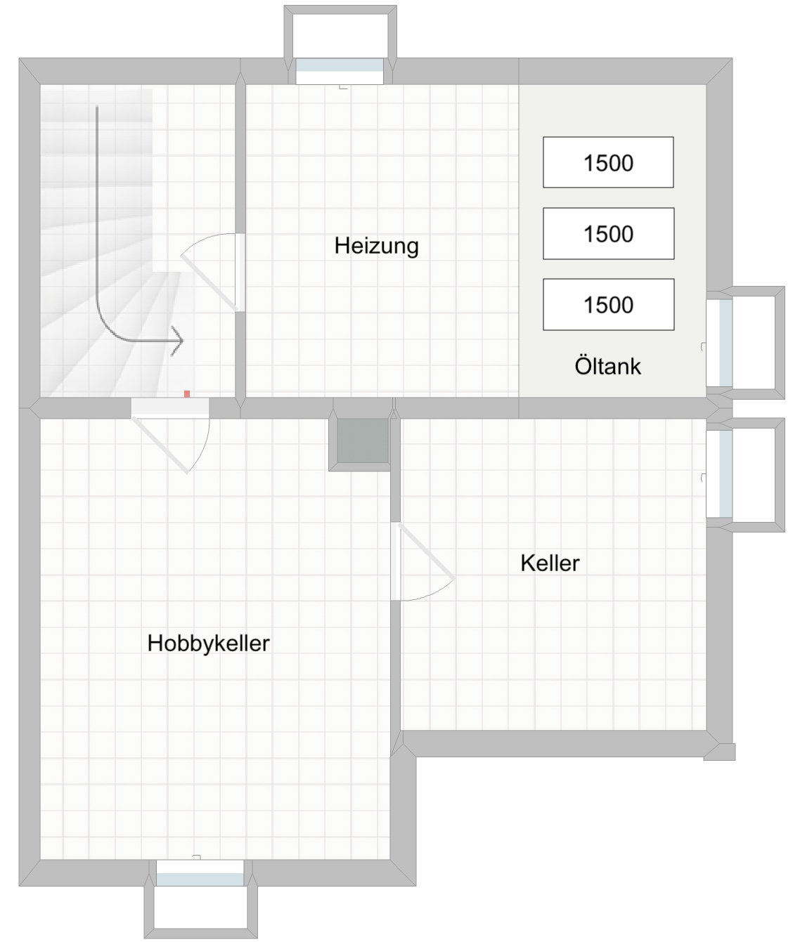 Keller: Heizraum mit Öllager, Lagerraum, Hobbyraum (beheizt)